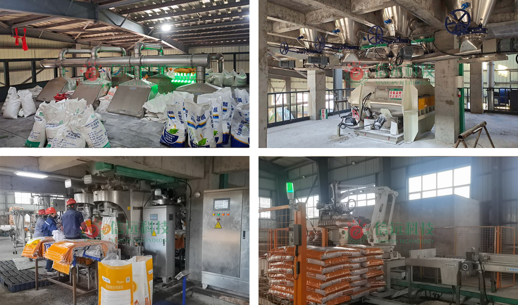 信遠科技為廣大肥料行業(yè)客戶推薦的這套年產(chǎn)1-2萬噸的固體粉劑水溶肥設(shè)備配置方案,適用于充填容量為5-50kg的編織袋、PP/PE袋,可以包裝大量元素水溶肥、中量元素水溶肥、微量元素水溶肥、含氨基酸水溶肥、含腐植酸水溶肥、含黃腐酸鉀水溶肥等不同配方的固體粉劑水溶肥產(chǎn)品。該套方案的前端和后端均采用了全自動化的設(shè)備系統(tǒng),把復(fù)雜繁重的作業(yè)工段交給設(shè)備來完成,減少了人工成本、降低了勞動強度、提高了產(chǎn)品配混的標(biāo)準(zhǔn)化和理包碼垛搬運的效率。