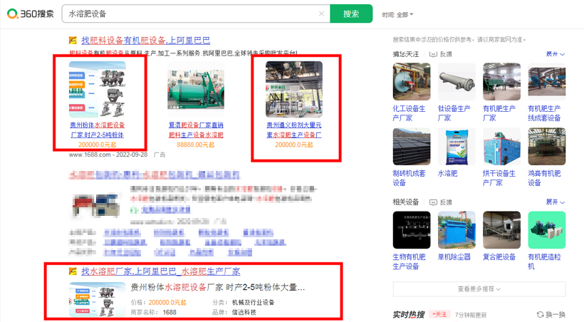 (以上為360搜索“水溶肥設(shè)備”,阿里巴巴在首頁主推的多個展現(xiàn)信息是信遠(yuǎn)科技)