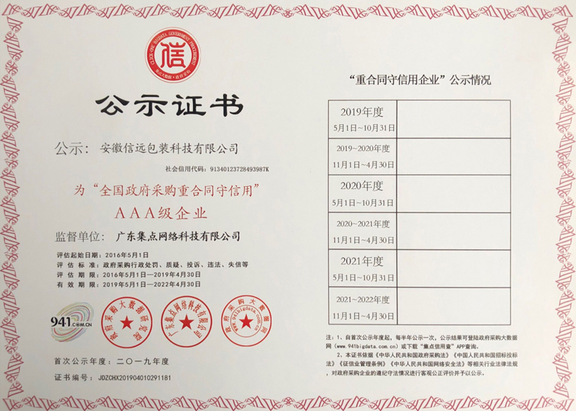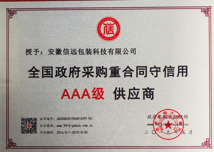 政府采購大數(shù)據(jù)研究院根據(jù)全國政府采購誠信記錄,對法理依據(jù)、地方執(zhí)法裁量權等多個方面進行科學的整理歸納后,將全國政府采購信用行為歸納為為22個類別。通過對供應商安徽信遠包裝科技有限公司14種行為信用數(shù)據(jù)進行綜合評估,授予信遠科技為“全國政府采購重合同守信用AAA級榮譽”.