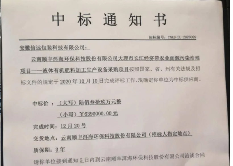 2020年10月13日我公司成功中標(biāo)“云南順豐洱海環(huán)??萍脊煞萦邢薰敬罄硎虚L江經(jīng)濟(jì)帶農(nóng)業(yè)面源污染治理項目——液體有機(jī)肥料加工生產(chǎn)設(shè)備采購項目”,中標(biāo)金額:639萬元。