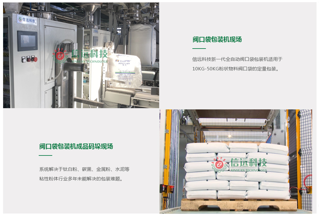 信遠科技新一代全自動閥口袋包裝機的上市,解決了鈦白粉、碳黑、金屬粉、水泥等粘性粉體行業(yè)多年未能解決的包裝難題,對粒性粉體和含氣量大的超細粉體具有包裝性能穩(wěn)定、精度高、閥口不掉料、無粉塵、包裝袋飽滿美觀等特點,可以替代進口設(shè)備的使用,適用于各種牛皮紙袋、覆膜編織袋、塑料袋、PE袋、鋁箔袋等包裝材料的閥口包裝袋。后端如果增配輸送碼垛設(shè)備,即可成為一條高效率的全自動生產(chǎn)流水線。