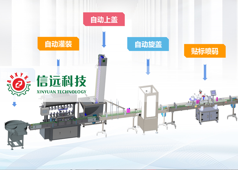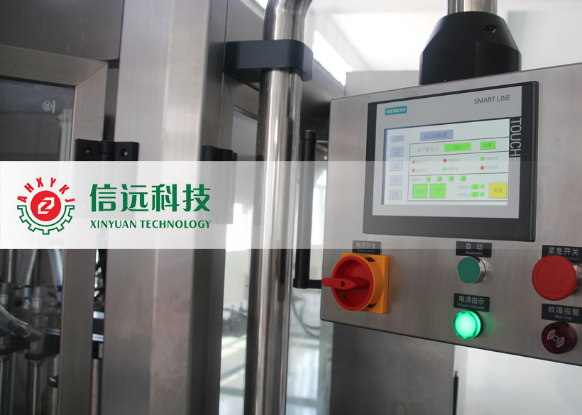 信遠科技瓶裝液體全自動灌裝機組,由理瓶機、灌裝機、上蓋/旋蓋機和貼標(biāo)噴碼機組成??梢怨嘌b單瓶容量在50-1000ml范圍之間的液體物料,生產(chǎn)企業(yè)可以根據(jù)自己的需要,選擇不同型號的灌裝機和配套輔機。這套機組設(shè)備采用不銹鋼材質(zhì)設(shè)計制造,適用于食品、化工、醫(yī)藥等行業(yè)不帶氣體的流體、半流體物料的計量灌裝,具有自動完成理瓶、進瓶、定位、灌裝、出瓶、上蓋、旋蓋、鋁箔封口、貼標(biāo)、噴碼等一系列功能。