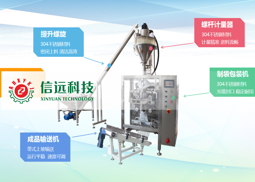 信遠科技粉劑全自動立式制袋包裝機組,是由密閉螺旋提升機、螺旋計量機、立式制袋包裝機和成品輸送機組成,可以包裝單袋克重在30-5000g范圍之間的粉狀物料,生產(chǎn)企業(yè)可以根據(jù)自己的需求選擇不同的包裝機型號。這套機組設備適合粉料和較大粉塵的超細粉狀物料的定量包裝,具有自動完成送料、計量、制袋、充填、封口、切包、打印、計數(shù)、輸送等一系列功能,是食品、化工、醫(yī)藥等行業(yè)提高包裝生產(chǎn)效率,打造無塵環(huán)保車間,提升包裝檔次的必選設備。