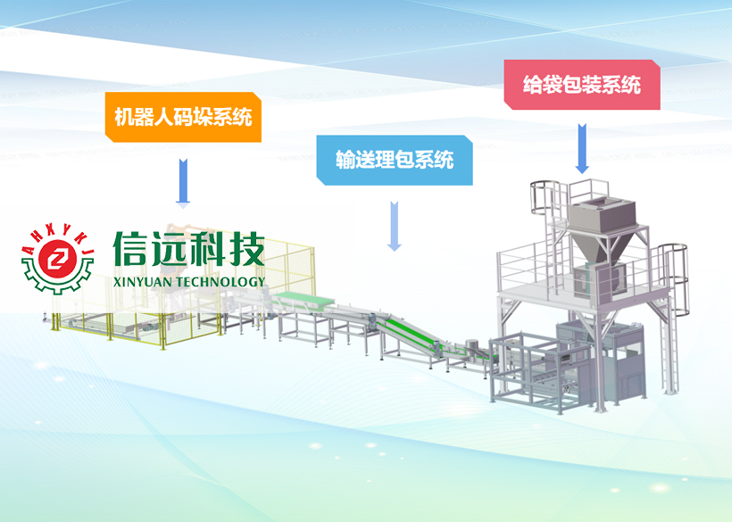 ■集自動給袋、上袋、夾袋、計(jì)量、充填、縫包、輸送、倒包、振實(shí)、壓平、理包、機(jī)器人碼垛、托盤庫于一體