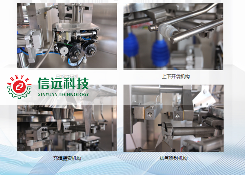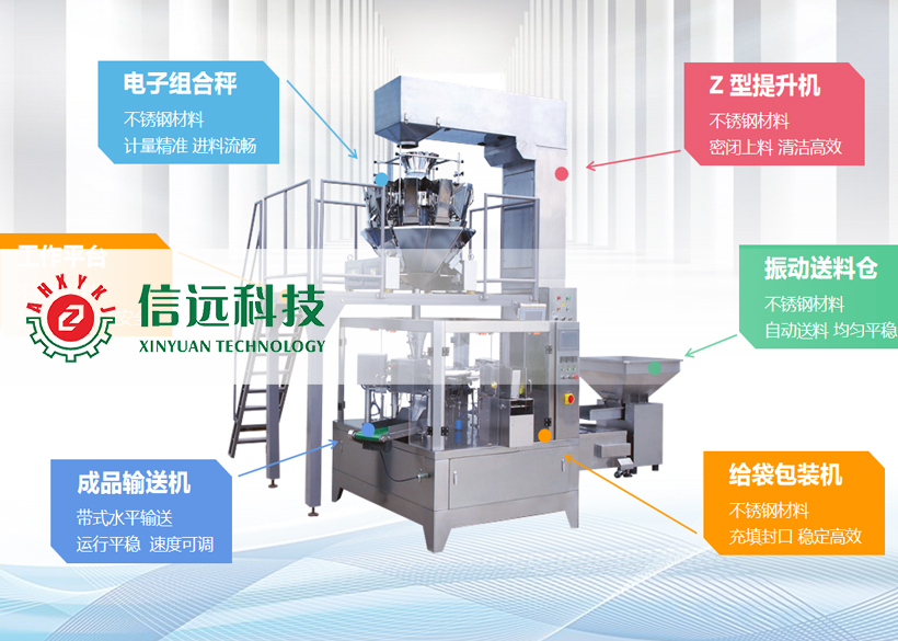 信遠科技顆粒料全自動旋轉(zhuǎn)式給袋包裝機組,是由密閉Z型提升機、電子計量組合秤、多工位旋轉(zhuǎn)式給袋包裝機和成品輸送機組成??梢园b單袋克重在30-5000g范圍之間的顆粒狀物料,生產(chǎn)企業(yè)可以根據(jù)自己的需求選擇不同的包裝機型號。這套機組設(shè)備適合各種顆粒狀、片狀、條狀、圓狀、塊狀及不規(guī)則形狀等物料的定量包裝,具有自動完成送料、計量、給袋、充填、封口、打印、計數(shù)、輸送等一系列功能,是食品、化工、農(nóng)資等行業(yè)提高包裝生產(chǎn)效率,打造綠色環(huán)保車間,提升包裝檔次的新型自動化裝備。