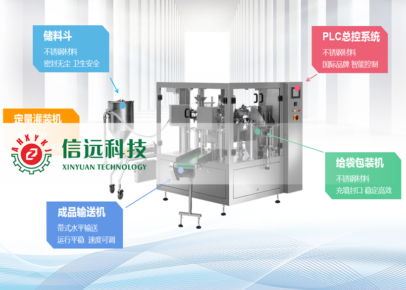 信遠科技液體全自動旋轉(zhuǎn)式給袋包裝機組,是由密閉儲料斗、定量灌裝機、多工位旋轉(zhuǎn)式給袋包裝機和成品輸送機組成??梢园b單袋克重在30-5000g范圍之間的液體物料,生產(chǎn)企業(yè)可以根據(jù)自己的需求選擇不同的包裝機型號。這套機組設備適用于食品、化工、醫(yī)藥等行業(yè)的流體、半流體物料的定量包裝,具有自動完成下料、計量、給袋、灌裝、封口、打印、計數(shù)、輸送等一系列功能。