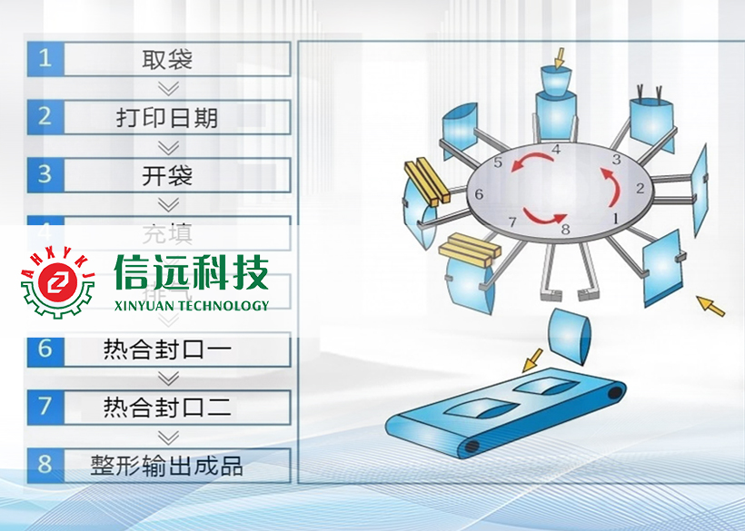 包裝機根據(jù)程序設計,自動完成取袋、立式上袋、打碼、開袋、充填、熱封以及整形輸出等各工位的有序運行。