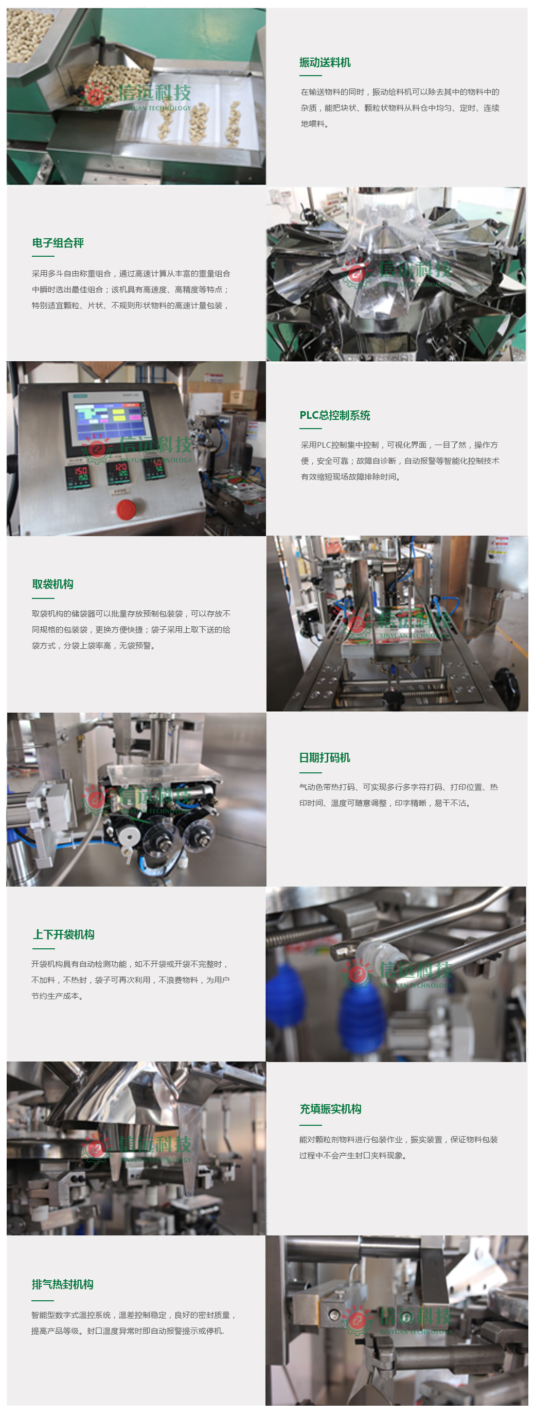 信遠(yuǎn)科技飼料顆粒全自動(dòng)旋轉(zhuǎn)式給袋包裝機(jī)組,是由密閉Z型提升機(jī)、電子計(jì)量組合秤、多工位旋轉(zhuǎn)式給袋包裝機(jī)和成品輸送機(jī)組成??梢园b單袋克重在30-5000g范圍之間的顆粒狀物料,生產(chǎn)企業(yè)可以根據(jù)自己的需求選擇不同的包裝機(jī)型號(hào)。這套機(jī)組設(shè)備適合各種顆粒狀、片狀、條狀、圓狀、塊狀及不規(guī)則形狀等物料的定量包裝,具有自動(dòng)完成送料、計(jì)量、給袋、充填、封口、打印、計(jì)數(shù)、輸送等一系列功能,是食品、化工、農(nóng)資等行業(yè)提高包裝生產(chǎn)效率,打造綠色環(huán)保車間,提升包裝檔次的新型自動(dòng)化裝備。