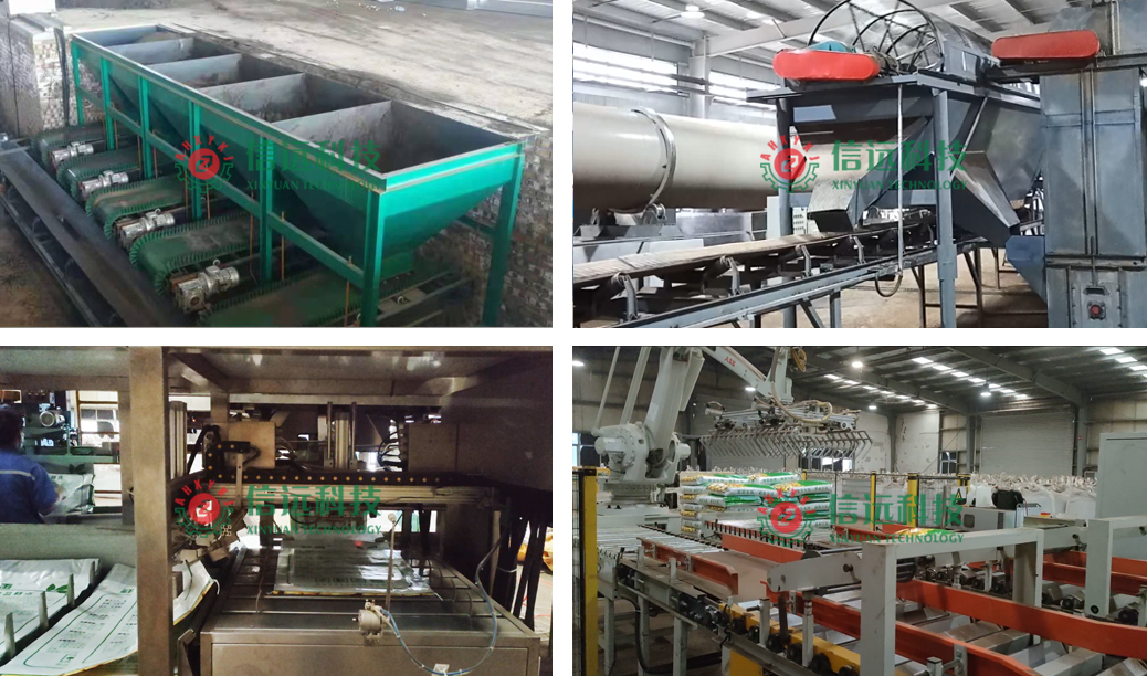 該套方案中的有機(jī)原料在一定周期內(nèi)通過翻堆通風(fēng)的方式完成發(fā)酵過程,腐熟后的原料經(jīng)過粉碎系統(tǒng)擠壓脫水進(jìn)入配料和攪拌系統(tǒng),混合均勻的原料卸料至高速回轉(zhuǎn)的造粒系統(tǒng)完成球化成粒,成粒原料需要經(jīng)過烘干、冷卻和篩分過濾,篩分環(huán)節(jié)可以設(shè)置一級(jí)篩分、二級(jí)篩分,使成品率更高,顆粒度更好的有機(jī)原料進(jìn)入包膜環(huán)節(jié)進(jìn)行粒度定型鞏固,然后進(jìn)入成品包裝環(huán)節(jié)。包裝工段可以實(shí)現(xiàn)自動(dòng)取袋、上袋、套袋、夾袋、計(jì)量、充填,當(dāng)袋內(nèi)物料達(dá)到設(shè)定重量后,自動(dòng)停止充填、自動(dòng)松袋落袋、抱袋裝置自動(dòng)推送至縫包機(jī)前,完成包裝袋封口。成品袋在輸送過程中,自動(dòng)完成倒包、振實(shí)、壓平等理包整形作業(yè),機(jī)器人進(jìn)行碼垛(雙包型抓手),叉車搬運(yùn)入庫(kù)。