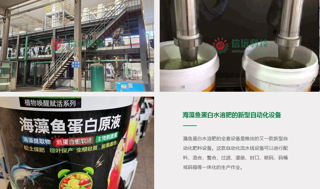 近年來,安徽信遠(yuǎn)包裝科技有限公司研發(fā)推出的水溶肥類生產(chǎn)設(shè)備比較多,其中用于生產(chǎn)海藻魚蛋白水溶肥的全套設(shè)備,是繼大量元素水溶肥設(shè)備、中量元素水溶肥設(shè)備、微量元素水溶肥設(shè)備、含腐植酸水溶肥設(shè)備、含氨基酸水溶肥設(shè)備、含黃腐酸鉀水溶肥設(shè)備等之后,推出的又一款新型自動化肥料設(shè)備。這款自動化流水線設(shè)備可以進行配料、混合、螯合、過濾、灌裝、封口、噴碼、碼桶或碼箱等一體化的生產(chǎn)作業(yè)。