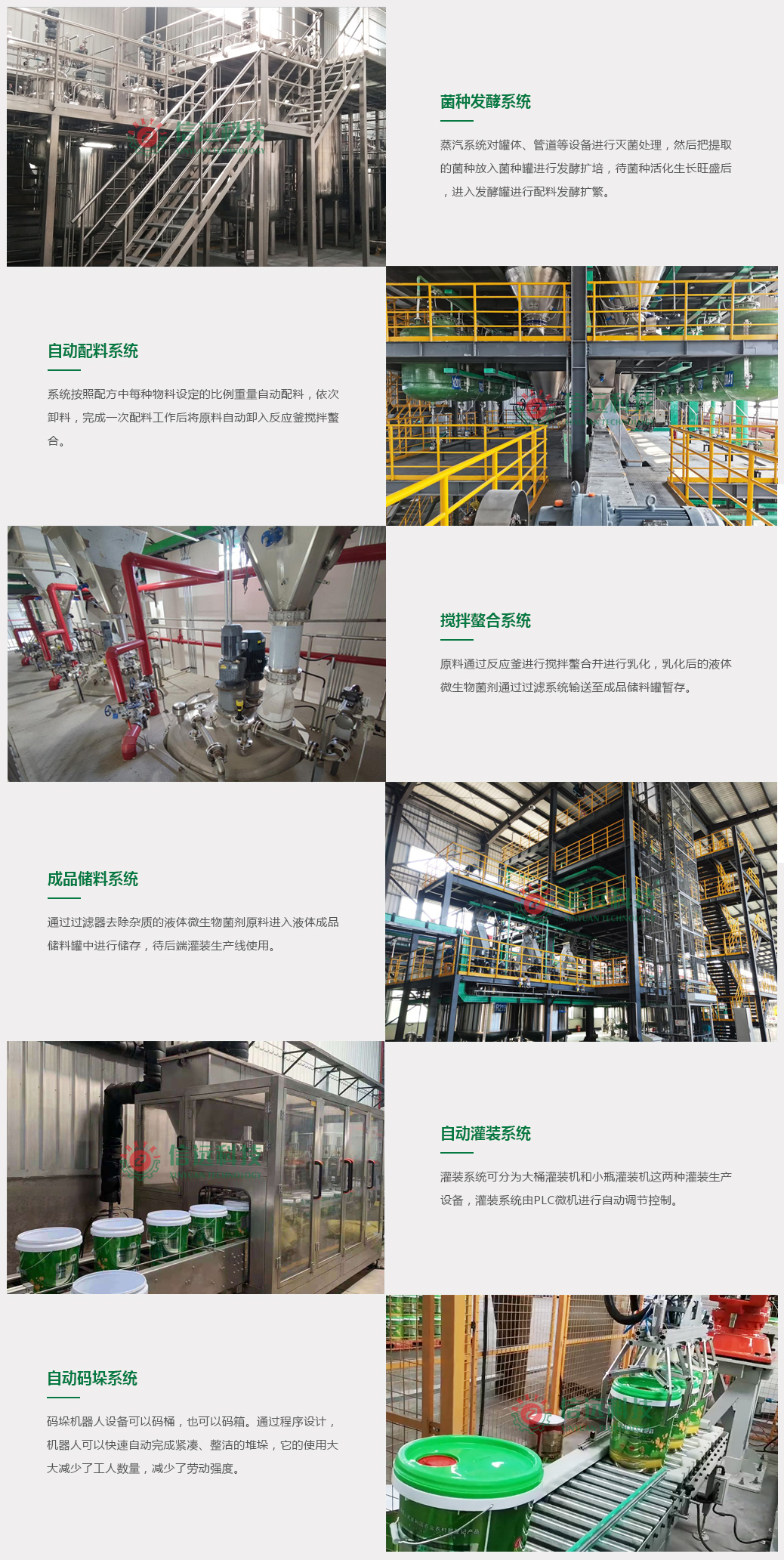 液體微生物菌劑全自動成套特肥設備,包含了設備滅菌、菌種發(fā)酵、配料發(fā)酵、擴繁培養(yǎng)、滅菌消泡、成品儲液、計量灌裝、上蓋封口和輸送碼垛等前后端全流程的生產(chǎn)裝置,是生產(chǎn)放線菌、固氮菌、硅酸鹽菌、枯草芽孢桿菌、木霉菌、酵母菌、光合細菌等不同種類微生物菌劑的理想設備。