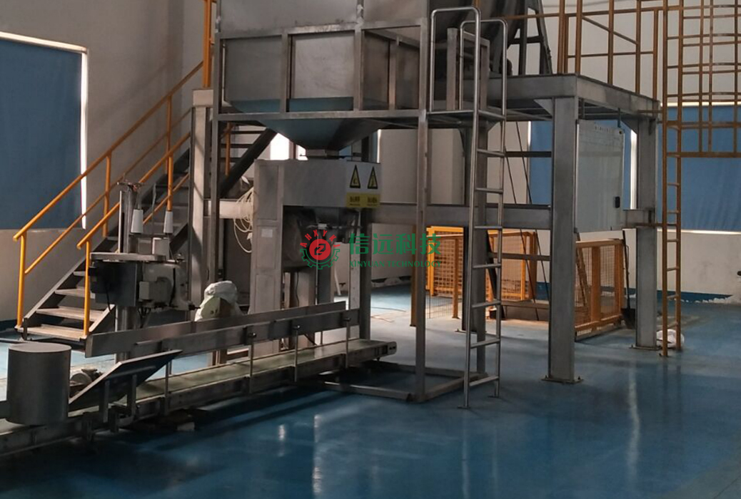 信遠(yuǎn)科技的這款顆粒料無斗包裝秤的工作原理是:由人工先套上包裝袋,然后自動(dòng)夾袋,系統(tǒng)檢測包裝袋到位后,無斗秤進(jìn)行稱重去皮工序;喂料機(jī)根據(jù)控制儀表設(shè)定的程序進(jìn)行快速加料,當(dāng)落入包裝袋中的物料達(dá)到預(yù)定的慢速計(jì)量重量時(shí),無斗稱開始慢速精確加料;稱重后,如果偏差太大,可報(bào)警通知人工處理或自動(dòng)慢速補(bǔ)重,直至達(dá)到穩(wěn)定的預(yù)定重量,完成加料工序;當(dāng)包裝秤判斷正常加料完成后,系統(tǒng)發(fā)出松袋信號(hào),包裝袋下落,打印機(jī)打印標(biāo)簽,產(chǎn)品進(jìn)入封袋、包裝工序;不斷往復(fù),實(shí)現(xiàn)自動(dòng)化包裝的定值包裝。然后通過輸送機(jī)推送到縫包機(jī)前,完成包裝成品。