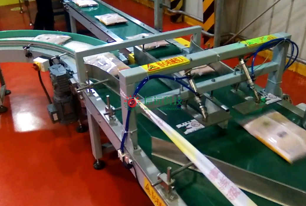 安徽信遠包裝科技有限公司自主研發(fā)設計的全自動重袋二次包裝生產線,是一種小袋裝大袋的二次包裝設備。包括小袋產品的包裝輸送機構、設于小袋包裝輸送機構一側的底部支撐架、傾斜式連接在底部支撐架上的分散輸送機構、連接在底部支撐架上端的計數(shù)灌裝機構以及連接在底部支撐架側部的大袋夾持機構,小袋包裝輸送機構的輸出端口位于分散輸送機構輸入端口的上方,分散輸送機構的輸出端口位于計數(shù)灌裝機構輸入端口的上方,計數(shù)灌裝機構的輸出端口位于大袋夾持機構輸入端口的上方等組件結構。在小袋有序落入大袋內后,自動完成灌裝、縫包、碼垛工作。