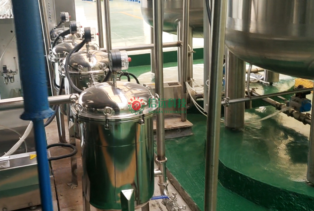 下面我們?cè)僦v一下與儲(chǔ)液罐配套比較緊密的一種設(shè)備:雙聯(lián)過濾器,也稱雙聯(lián)切換過濾器,該設(shè)備置于成品儲(chǔ)液罐的前端,作用是把螯合乳化后的原液進(jìn)行標(biāo)準(zhǔn)化過濾,然后輸送至成品儲(chǔ)液罐內(nèi)暫存。該設(shè)備由兩臺(tái)不銹鋼過濾器并聯(lián)而成,內(nèi)外表面拋光處理,濾筒內(nèi)裝有不銹鋼濾網(wǎng)和濾袋;頂部裝有放氣閥,供過濾時(shí)排放濾器內(nèi)空氣作用。上蓋與濾筒連接采用快開式結(jié)構(gòu),清洗過濾器時(shí)不必停車,保證其連續(xù)工作,是不停車生產(chǎn)線過濾裝置的首選;連接管路采用活接或卡箍連接方式,進(jìn)出料閥門采用三通球閥啟閉,耐壓耐溫,操作靈活方便,不會(huì)出現(xiàn)料液泄漏的情況。整機(jī)具有結(jié)構(gòu)合理、密封性好、流通性強(qiáng)、過濾精度高、操作簡便等諸多優(yōu)點(diǎn),是一種應(yīng)用范圍比較廣泛的多用途過濾設(shè)備。