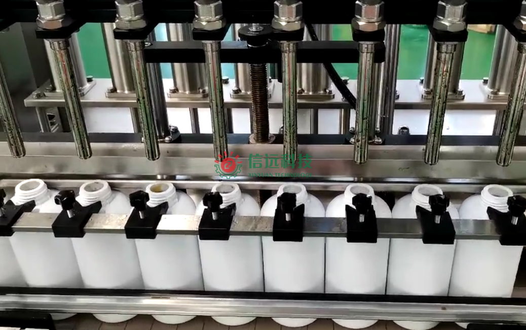 各位網(wǎng)友大家好,前面一期內(nèi)容我們講了生產(chǎn)液體水溶肥的桶裝灌裝機及其關聯(lián)配套設備。本期我們來講另一種灌裝液體水溶肥的專用設備——瓶裝灌裝機,該灌裝機可以灌裝100-1000ml容量的方瓶、圓瓶和異形瓶,灌裝頭數(shù)量設計有兩頭、四頭、六頭、八頭、十頭等,不同的機型配置的灌裝頭數(shù)量不同,水溶肥生產(chǎn)廠家可以根據(jù)自己的產(chǎn)能需要進行選配。由于水溶肥具有腐蝕性,整機均采用不銹鋼材質(zhì)制造,美觀大氣、經(jīng)久耐用。