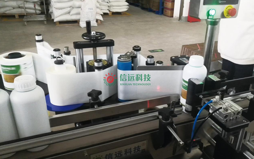 完成旋蓋后的瓶子要進行貼標,全自動圓瓶貼標機是生產(chǎn)瓶裝液體水溶肥常用的一種配套輔助設備,粘貼效率高、粘貼效果好、粘貼位置準確。該機使用不干膠卷筒標貼紙,標貼采用滾貼方式完成貼標簽的過程,適用圓周單標、雙標、定位貼標、滿周貼標等貼標形式。該機的工作原理是分瓶輸送機構將瓶子逐一分開放行,傳感器檢測到瓶子到達指定位置,信號傳到貼標控制系統(tǒng),卷筒自動送出標簽并貼附在瓶身上,覆標裝置帶動圓瓶轉(zhuǎn)動,標簽完成粘貼??蛇x配色帶打碼機和噴碼機,在標簽上打印生產(chǎn)日期和批號信息,實現(xiàn)貼標賦碼一體化。