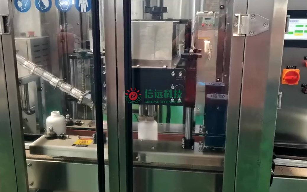 下面我們講一下全自動旋蓋機,也是上蓋之后的工序。旋蓋機有很多種,今天我們介紹一種四輪旋蓋機,該機的工作原理是當瓶子到達指定位置夾瓶固定后,傳感器自動觸發(fā)掛蓋裝置自動放蓋至瓶口上方,四個輪子通過傳動系統(tǒng)夾住瓶蓋,沿著瓶口旋轉(zhuǎn)的方向平衡地施加力量,將蓋子旋入瓶子的口部,從而完成封蓋操作。該機采用全自動操作模式,能夠適應不同瓶高和瓶徑的瓶子,四輪旋蓋頭采用橡膠輪,旋蓋力矩可調(diào)、力度均勻,鎖蓋范圍寬,可鎖不同規(guī)格的瓶蓋,具有通用性強、適用范圍廣、封蓋效率快、封蓋質(zhì)量高等特點。