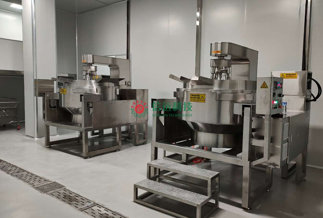 信遠(yuǎn)科技電磁炒鍋熬油炒料一體機(jī),容積大、產(chǎn)量高、升溫快、溫度高,攪拌無死角,不粘鍋、糊鍋,配有溫度顯示裝置,可設(shè)定溫度,到達(dá)溫度自動(dòng)斷電。可實(shí)現(xiàn)單控、雙控,從而調(diào)控功率大小。其外掛設(shè)計(jì)更人性化,操作、清洗使用更合理,液壓傾斜倒料系統(tǒng)更穩(wěn)定可靠,被廣泛應(yīng)用于食品業(yè)加工中。適用于各種高粘度醬料的攪拌加熱蒸煮炒制:肉制品熟食加工業(yè)(魚子醬、肉醬、海鮮醬),調(diào)味品業(yè)(火鍋底料、燒烤醬料、方便面醬料),蔬菜醬類業(yè)(辣椒醬、香菇醬、蘑菇醬)等食品加工業(yè),生產(chǎn)的醬料質(zhì)量穩(wěn)定,效果好。